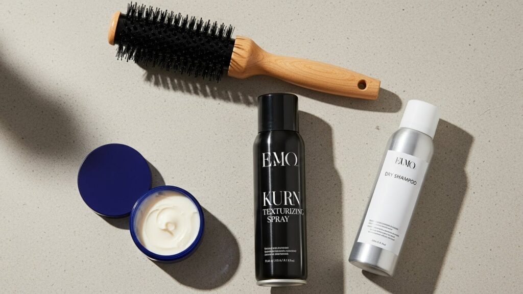 For Texture: Apply a texturizing spray or sea salt spray to damp or dry hair. Scrunch upwards with your hands. A matte pomade or wax rubbed between your palms can be used to define those piece-y ends and separate layers.