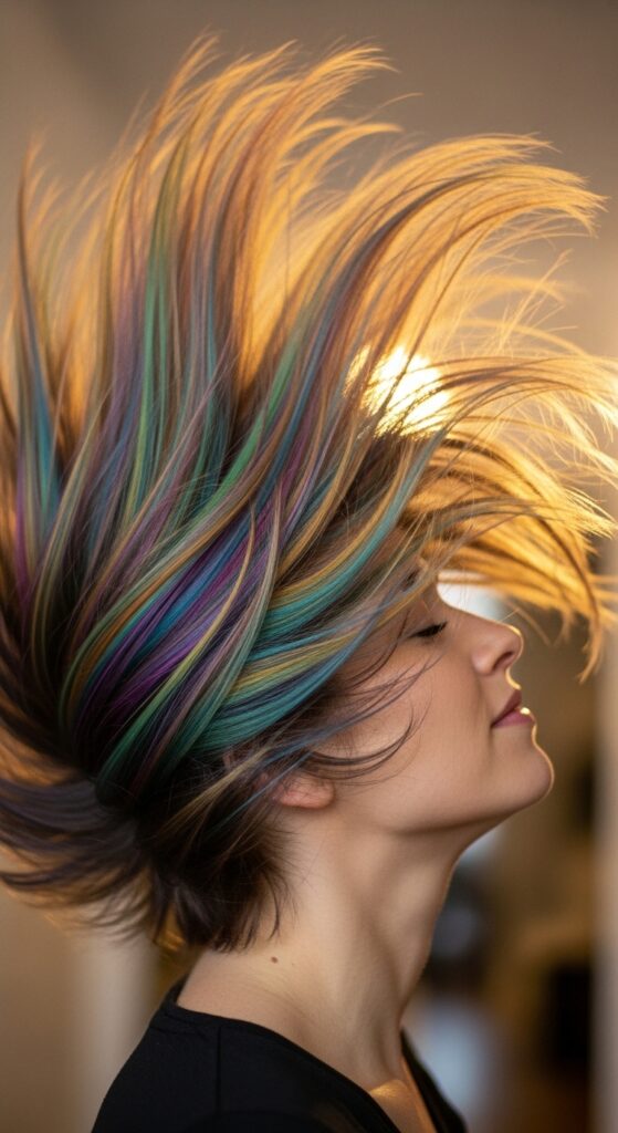 Glitchy glam hair is the art of deliberate, beautiful disruption. Use the sunburst placement to create “glitches.” Ask your colorist to place small, contrasting color bursts—think a chunk of bright silver next to a chunk of jet black.