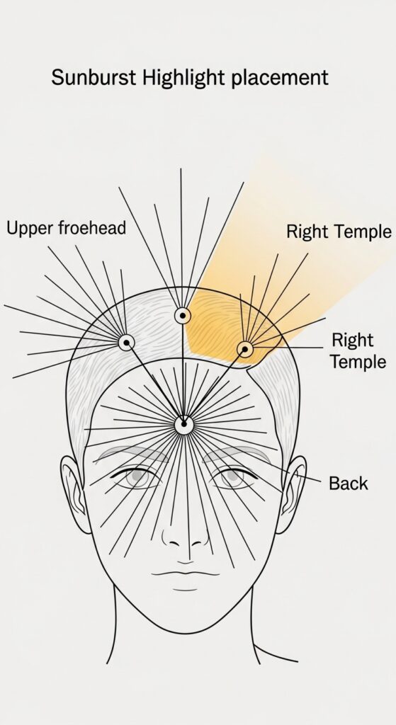 Forget counting foils. “Partial” means we’re only coloring the top and side sections you see most—the crown and around your face. “Sunburst” describes how the highlights are placed: radiating from multiple points, like little suns, to create a 360-degree glow.