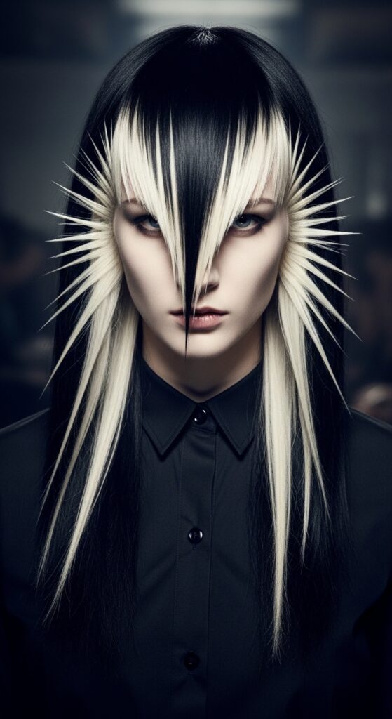 The vampire haircut (those sharp, face-framing layers) was made for this. Imagine those long, black curtain bangs with a few vibrant crimson or icy platinum sunburst highlights radiating from the part.