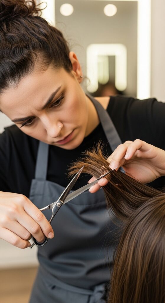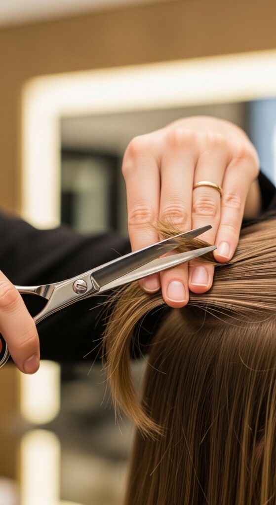 Then, they’ll go back through sections, often holding the hair at an angle and using the points of their shears to snip into the ends or mid-lengths. This is the angling/texturizing phase. It requires focus and precision.