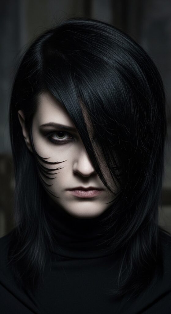 The heavy graduation at the crown creates lift, while intense angling on the face-framing layers gives you those iconic, wispy tendrils. It’s structured chaos, and it’s gorgeous for romantic goth hairstyles.