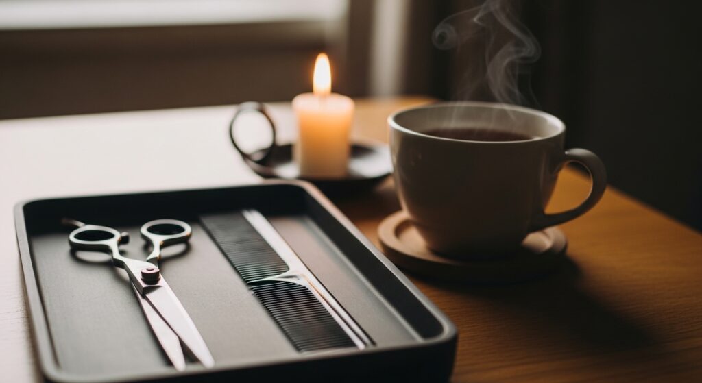 You’ll also need a fine-tooth comb, two hair clips to section your hair, and good lighting. A mirror you can get close to is essential. That’s really it. Set up in a bright, comfortable space where you can take your time.