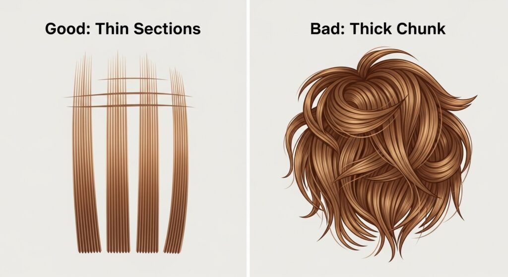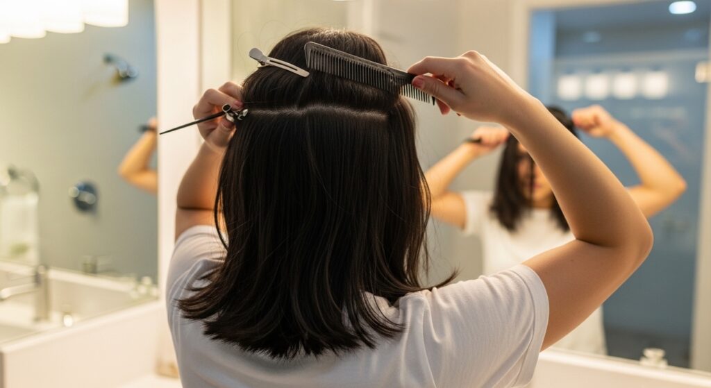 Clip the top section up. You should be working with just the bottom, back section of hair first. This methodical approach lets you focus on small, manageable pieces without missing spots.
