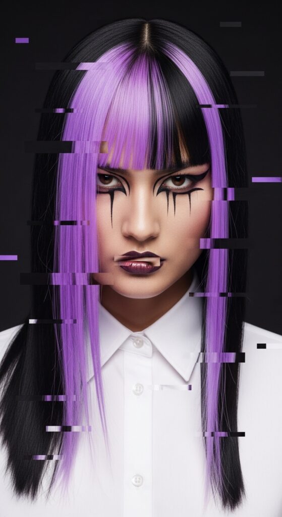 If “soft and dreamy” isn’t your only vibe, let’s glitch it. The glitchy glam hair trend is about intentional, almost digital-looking color placement. Think a solid block of lilac behind the ear, or a streak that doesn’t follow the usual pattern.