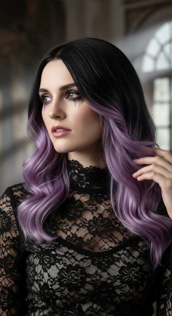 Lilac and lavender are secret stars in the romantic goth hairstyles palette. Against jet black hair, these pastel streaks look hauntingly beautiful. It’s like a soft light in the darkness, pure poetry for your hair.