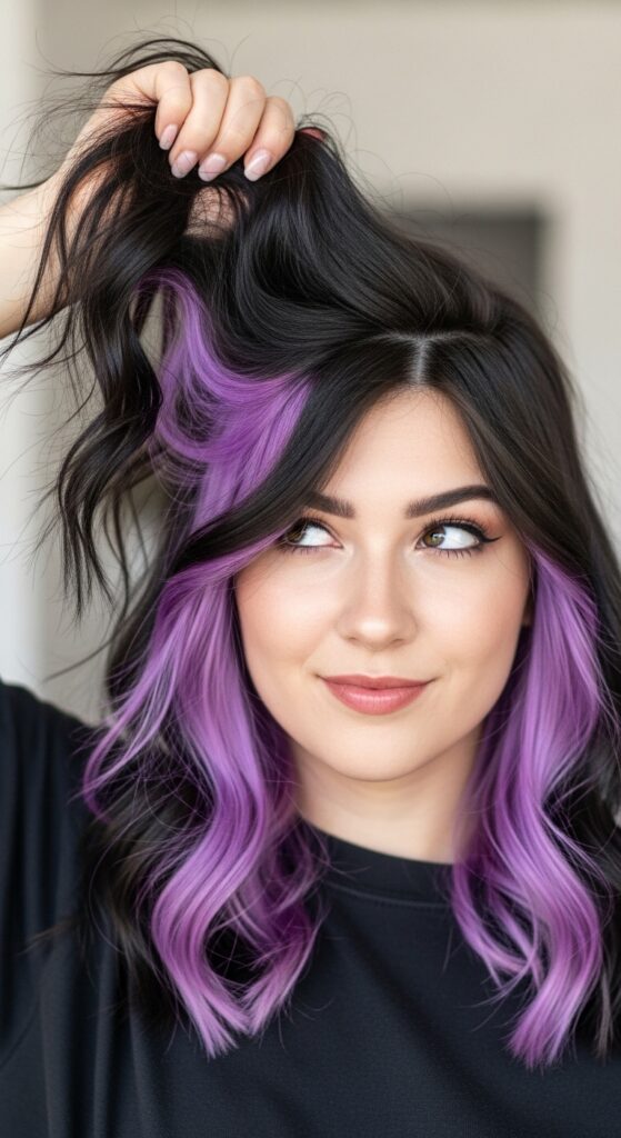 Underlights are the secret weapon of hair color. Having lilac streaks placed underneath your top layer is the most fun surprise. With your hair down, you get subtle glimpses. Put it in a ponytail or updo, and BAM—a gorgeous pop of color.