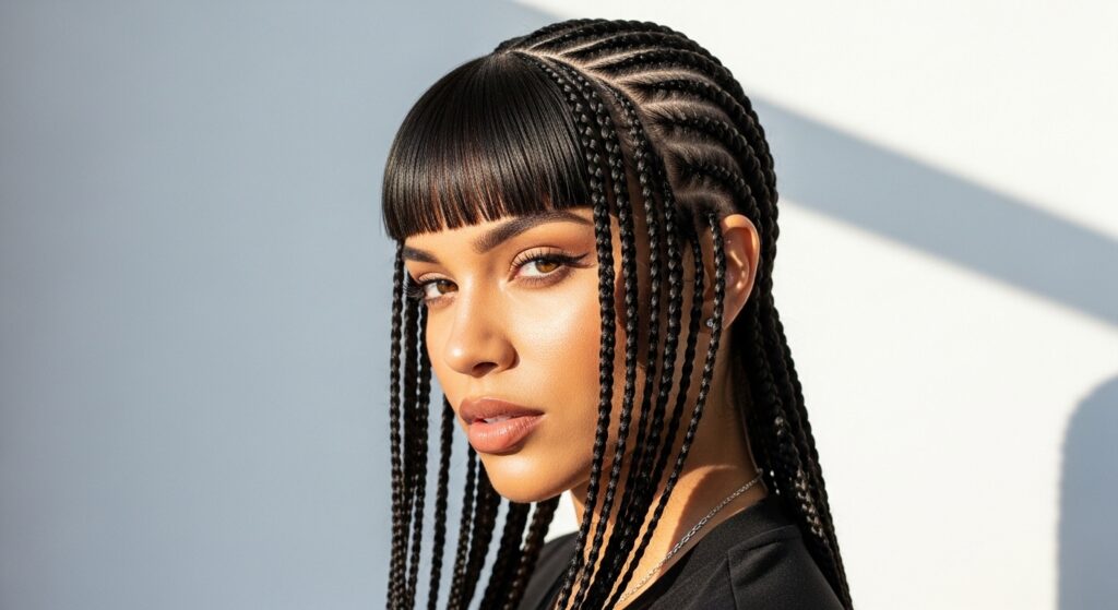 Love the dramatic, geometric look of a hime cut but don’t want to cut your hair? Your braids can create the perfect illusion. It’s a bold, statement look that changes your entire silhouette.