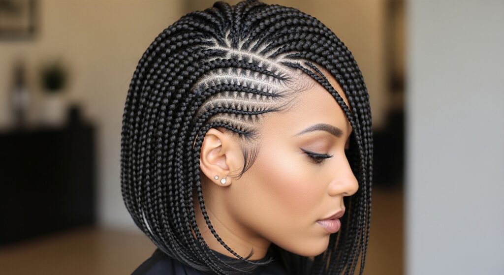 Craving a chic, modern chop like an asymmetrical lob? Style your braids to mimic the shape. It’s a cool, architectural look that feels very fresh and modern, playing with different lengths.