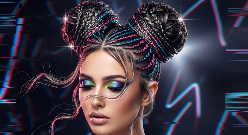 Split your braids into two high pigtails. Twist each into a bun, but don’t pin all the ends. Leave some pieces sticking out deliberately. Pull out tiny hairs around your face and nape. A spritz of colored or metallic hair spray adds the “glitch.”