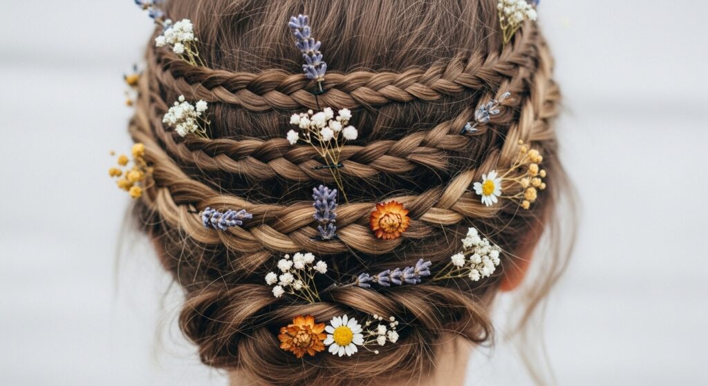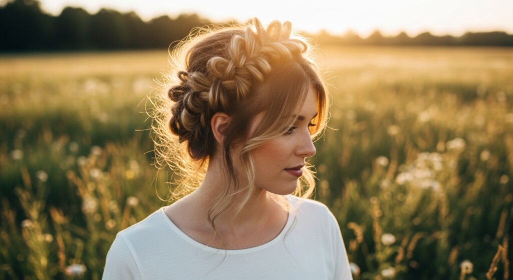 Simply gather the top section of your braids and twist them gently back, securing with pins as you go. Don’t aim for perfection. A few loose pieces make it feel soft and lived-in.