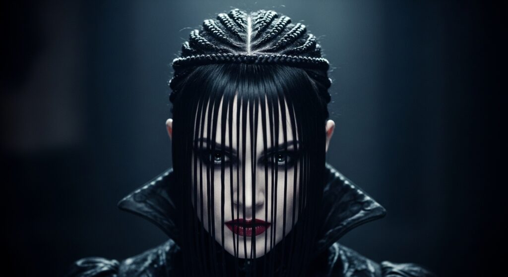 Channel the sharp, mysterious allure of the vampire haircut. It’s all about a heavy, blunt fringe and stark lines. Your braids are perfect for creating that structured, dramatic frame around the face.