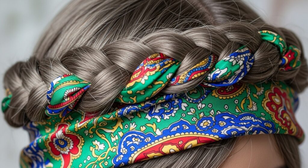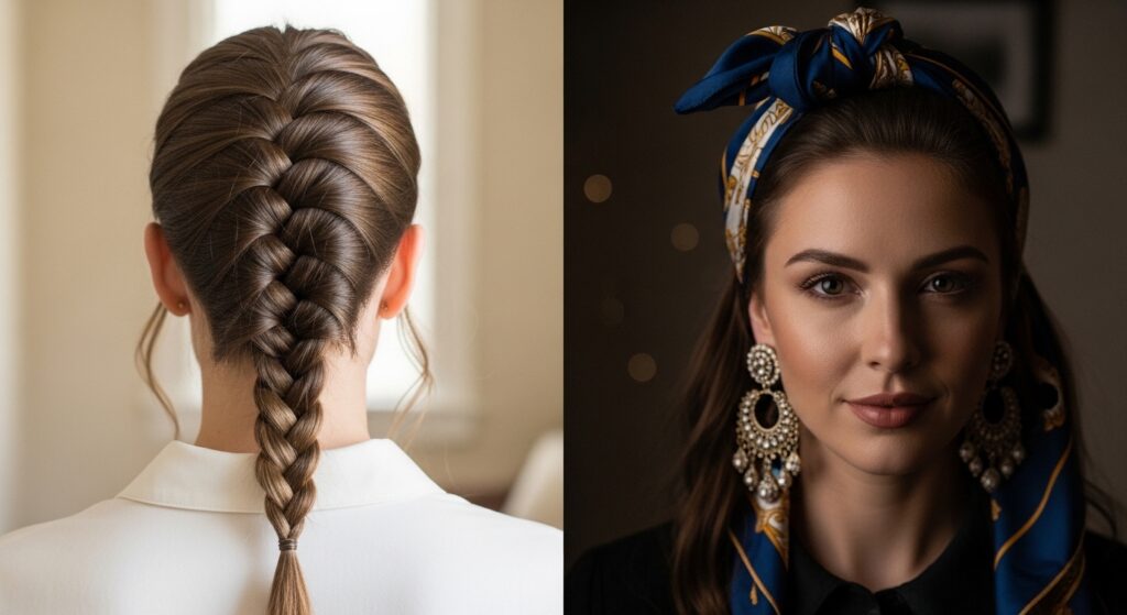 Want instant color and luxury? Grab a skinny silk scarf. This trick makes any basic braid look expensive and intentionally stylish. It’s a nod to old money hair aesthetics—effortless and quality-focused.