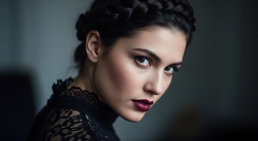 Go for a deeper side part and braid with intentionally messy texture—think slightly teased sections before braiding. Use a matte hairspray for piece-y definition. Pair it with deep makeup and you’ve got a look that’s both soft and striking, a far cry from a simple vampire haircut but in the same family.