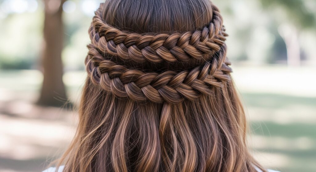 Create two separate rope braids, one starting at each temple. Follow the same path as the classic crown circle, but have them run parallel to each other. Let them meet at the nape of your neck. You can tie them together or leave them separate for a more undone look.