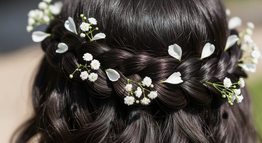 Keep your braid slightly looser. As you pin it in place, tuck small sprigs of greenery or tiny flowers like baby’s breath into the braid. Secure them with bobby pins. Avoid large, heavy flowers as they can weigh the braid down.
