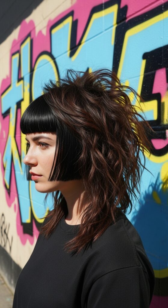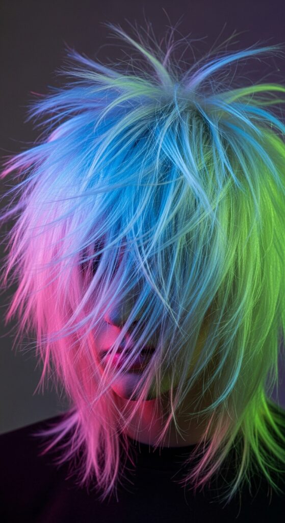 Keep the front “princess” sections at jaw length or longer. Behind them, let the shag layers fly free. It’s a playful, anime-inspired look that truly stands out in a crowd of standard shags.
