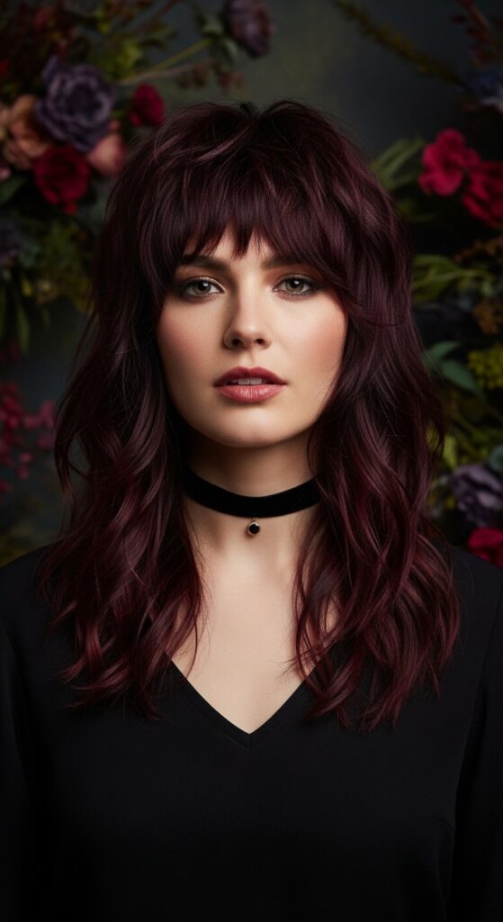 Moody, poetic, and deeply pretty. This take blends shaggy layers with romantic goth hairstyles elements. Think less scary, more Victorian romance novel heroine. It’s perfect for dark hair, but adding deep burgundy or shadow roots to lighter hair creates the same effect.