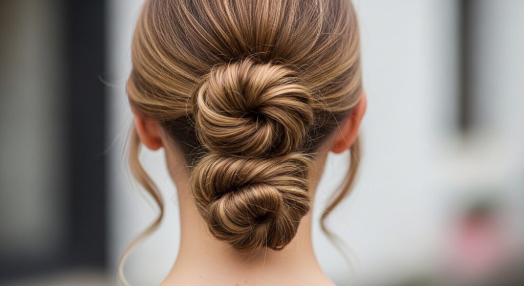 This looks intricate but is surprisingly simple. Create two low ponytails, one directly above the other. Twist each into a small bun and pin them separately.