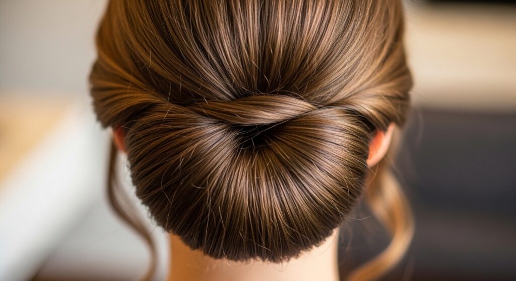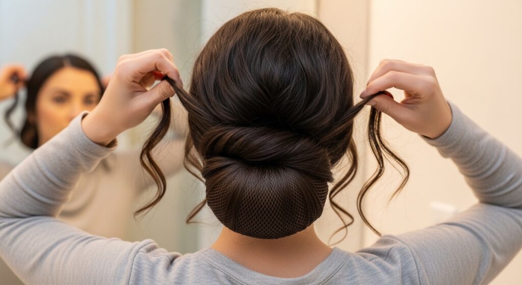 For a fuller, more polished bun, a hair donut is your secret weapon. Place your hair in a low ponytail and slide the donut over it. Fan your hair evenly over the form.
