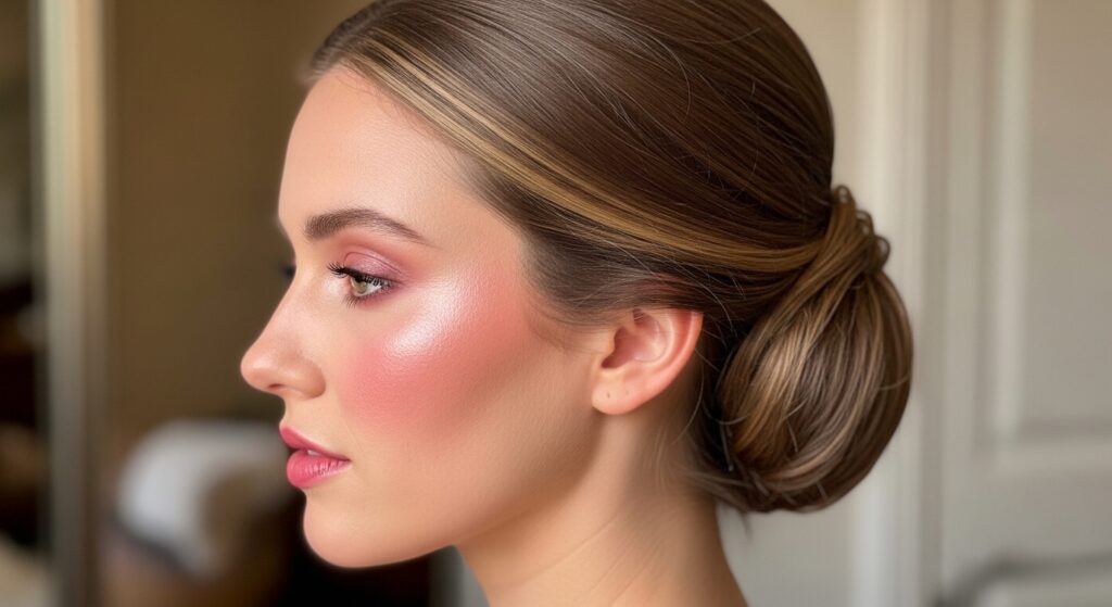 Think of your look as a whole. For tea parties, I lean towards soft, blushed cheeks and defined lashes to keep the focus on the elegant hair.