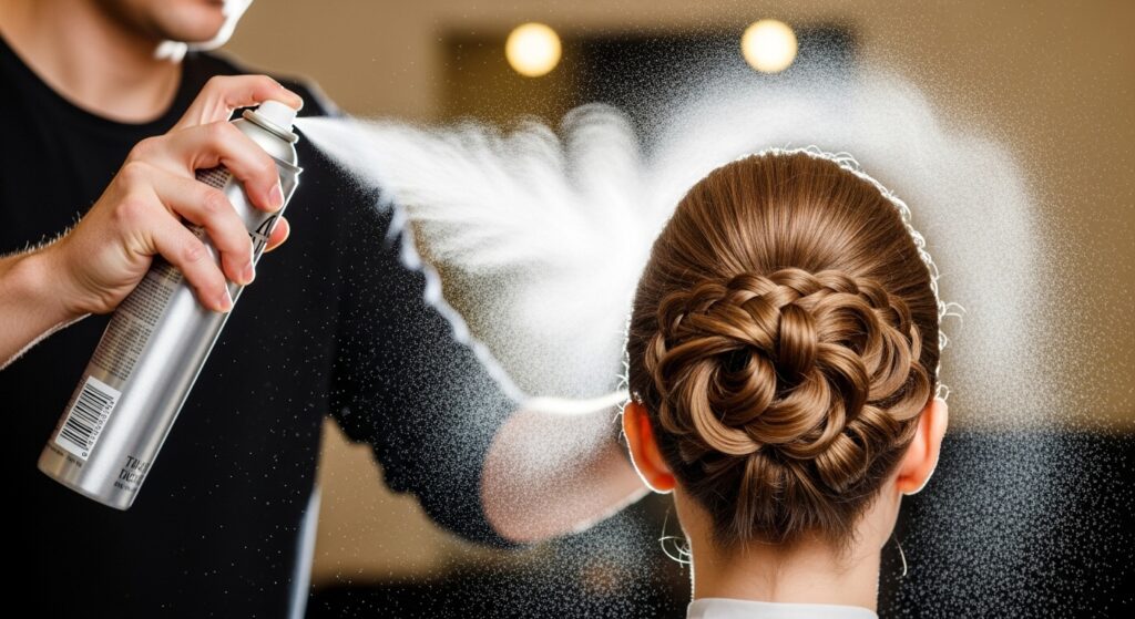 Hold your hairspray about 10 inches away from your head. Give a few light, all-over sprays. Let it settle for a second, then do one more targeted spray on the rolls.