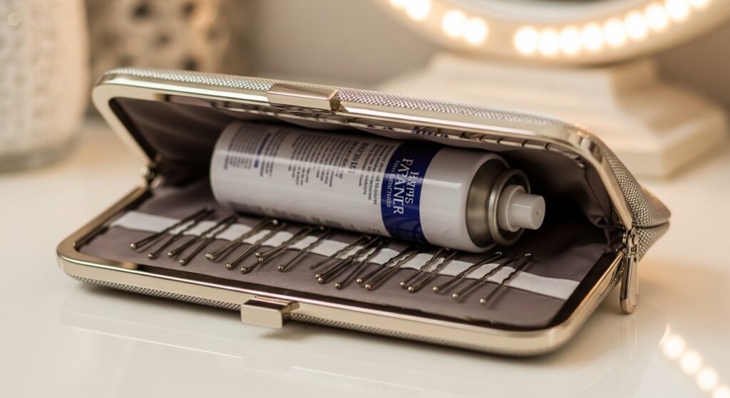 Toss a few extra bobby pins and a travel hairspray in your clutch. If you feel a section loosening after hours of dancing, find a bathroom, pin it back, and mist lightly.