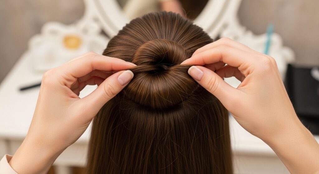 Fan and shape this loop to cover the elastic band. This creates the signature “roll” appearance. It should sit just above or over the foundation roll you already made.
