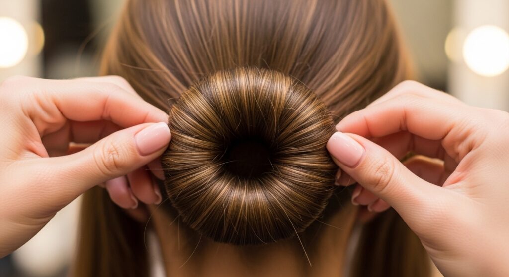 If you have fine hair, don’t skip the texturizing spray at the start. You can also use a small, silicone “donut” bun form. Place it where your foundation roll goes, and wrap your hair around it.