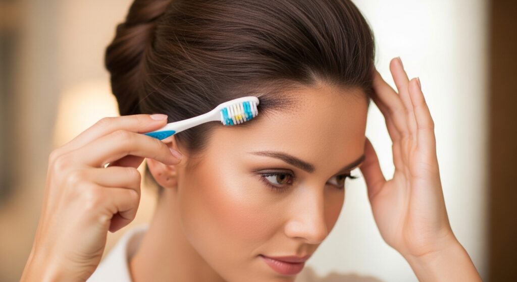 Even the most elegant updo can be ruined by little flyaways. Spray a light mist of hairspray on a clean toothbrush or a small bristle brush.