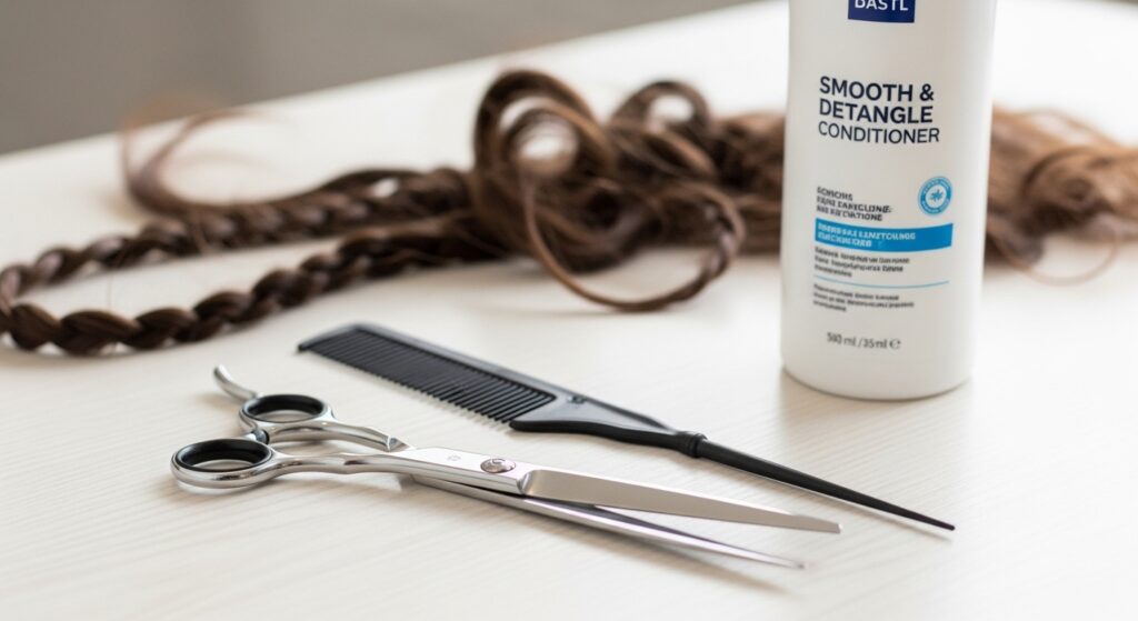 - Gather Supplies: You’ll need sharp, small hair shears, a tail comb, a detangling conditioner, and patience.