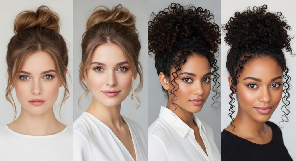 The “Pineapple” Updo for Curly Hair: A fantastic protective style. Gather all your hair into a very high, loose ponytail on top of your head, securing it with a soft scrunchie without pulling the hair tight. Let the curls spill out freely for a joyful, voluminous look.