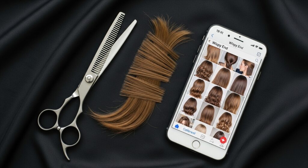 Bringing visual references is always a good idea. Look for photos that show the ends of the hair clearly, not just the overall style. Point out what you like: the transparency, the uneven finish, the way it moves. Key terms your stylist will understand include: point cutting, feathering, effilating, and texturizing. These all describe techniques used to create that wispy effect without compromising the overall length or shape drastically.